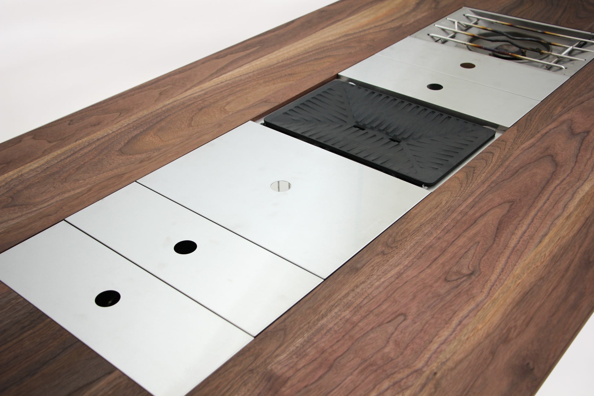 Snow Peak IGT規格のプロダクトが最大5ユニット(1900サイズの場合)分取付使用ができるダイニングテーブル。